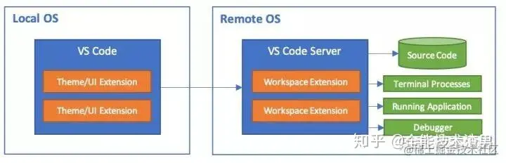 Extension Host(也就是图中的 VS Code Server)与主程序做到了物理级别的分离,那么把 Extension Host 在远程或者本地跑没有本质的区别