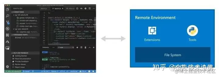今年五月,VS Code 发布了 Remote Development (VSCRD),有了它,我们可以在远程环境(比如虚机、容器)里开一个 VS Code 工作区,然后用本地的 VS Code 连上去工作,下图说明了它的运行模式: