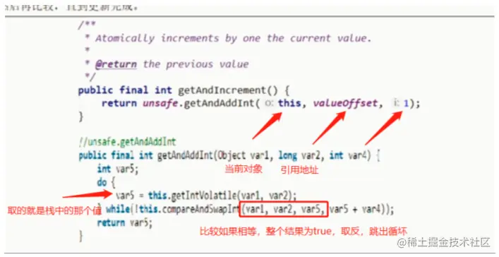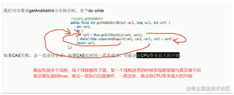 CAS的方法其实是一个自旋锁,当条件成立的时候,他就跳出循环,没有成立期间,会一直进行自旋,如图所示: