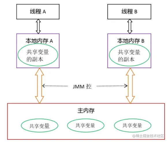 每个线程在操作的时候都会有一个属于自己的工作内存(即上图中的本地内存),这些工作内存存在的变量都是从主物理内存(即上图的主内存)拿到的,那么在进行更改的时候,需要在本地工作内存先进行操作,之后再写到主物理内存,其他线程再去取主物理内存中的值,确保数据在每个线程都是可见的,这个时候可能会有人有疑问为什么不直接在主物理内存操作,原因就是主物理内存并不能直接操作,不然也不会要有本地工作内存在,需要注意的是JMM模型并不真实存在,而是一套规范。