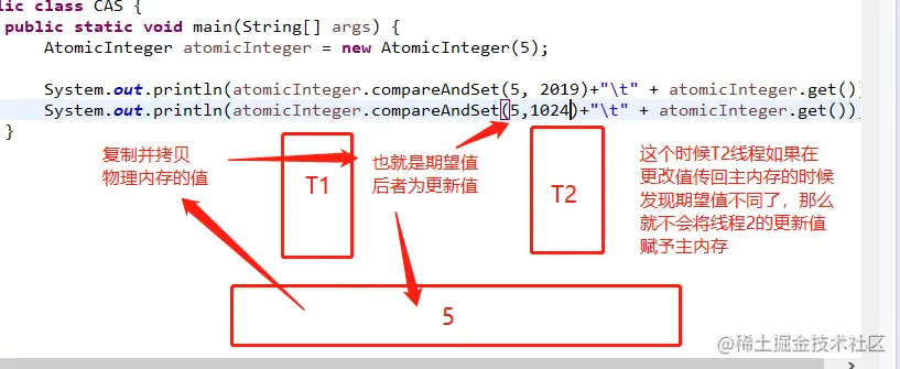 应用: CAS中有三个值,内存值V,旧的预期值A,要更改的值B 当且仅当A等于V时,将V修改为B,否则什么都不做,可以运用Atomic类来实现,如图所示: