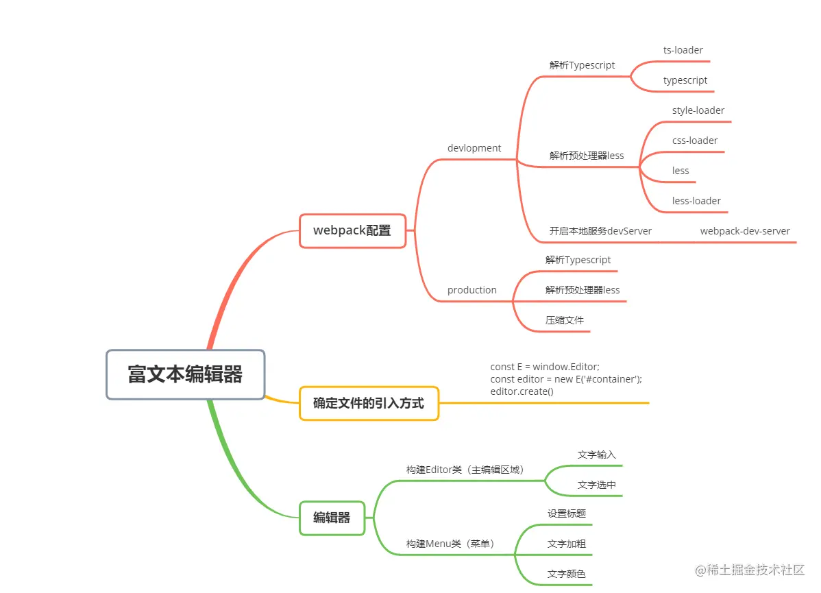 因为我这里主要使用TypeScript去撸的代码,所以我们首先是由webpack来构建一下我们项目的基本结构。 从思维导图中我们可以看到webpack的配置分为两种模式,开发环境和线上环境,在这里可以通过书写两个文件来实现不同的配置方式,然后在package.json的script脚本中使用 --config ./webpack.xxx.config.js来指定各个命令使用的webpack配置。 因为这些都是webpack的基本配置,所以不做赘述了,具体的配置可以在仓库里查看。
