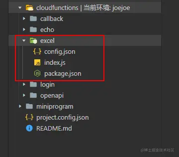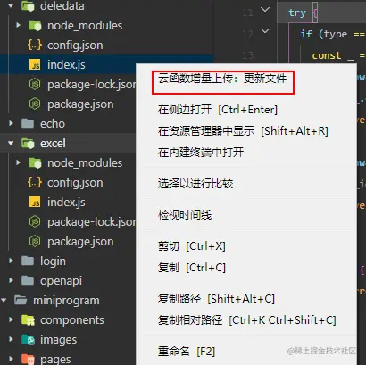 3、编写好所有的云函数后,可以右键点击刚好已经搞好的两个云函数deleData和excel选择上传并部署,部署成功后,以后如果要来修改对应的index.js的业务逻辑的时候,把修改好的index.js增量上传就好。