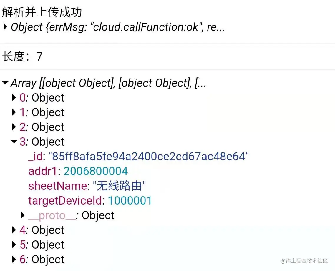 1、使用wx.chooseMessageFile来选择微信对话列表中的文件,wx.chooseMessageFile上传文件,wx.cloud.callFunction调用我们前面所创建的云函数excel并成功返回解析后的数据,完整代码如下: