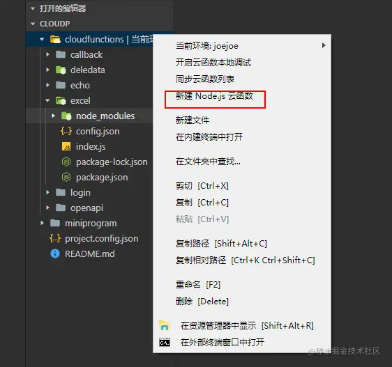 1、在cloudfunctions的目录下右键点击选择新建Node.js云函数,新建一个云函数