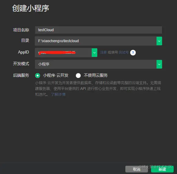 1、填写小程序appid,选择建立云开发模板,点击创建按钮。