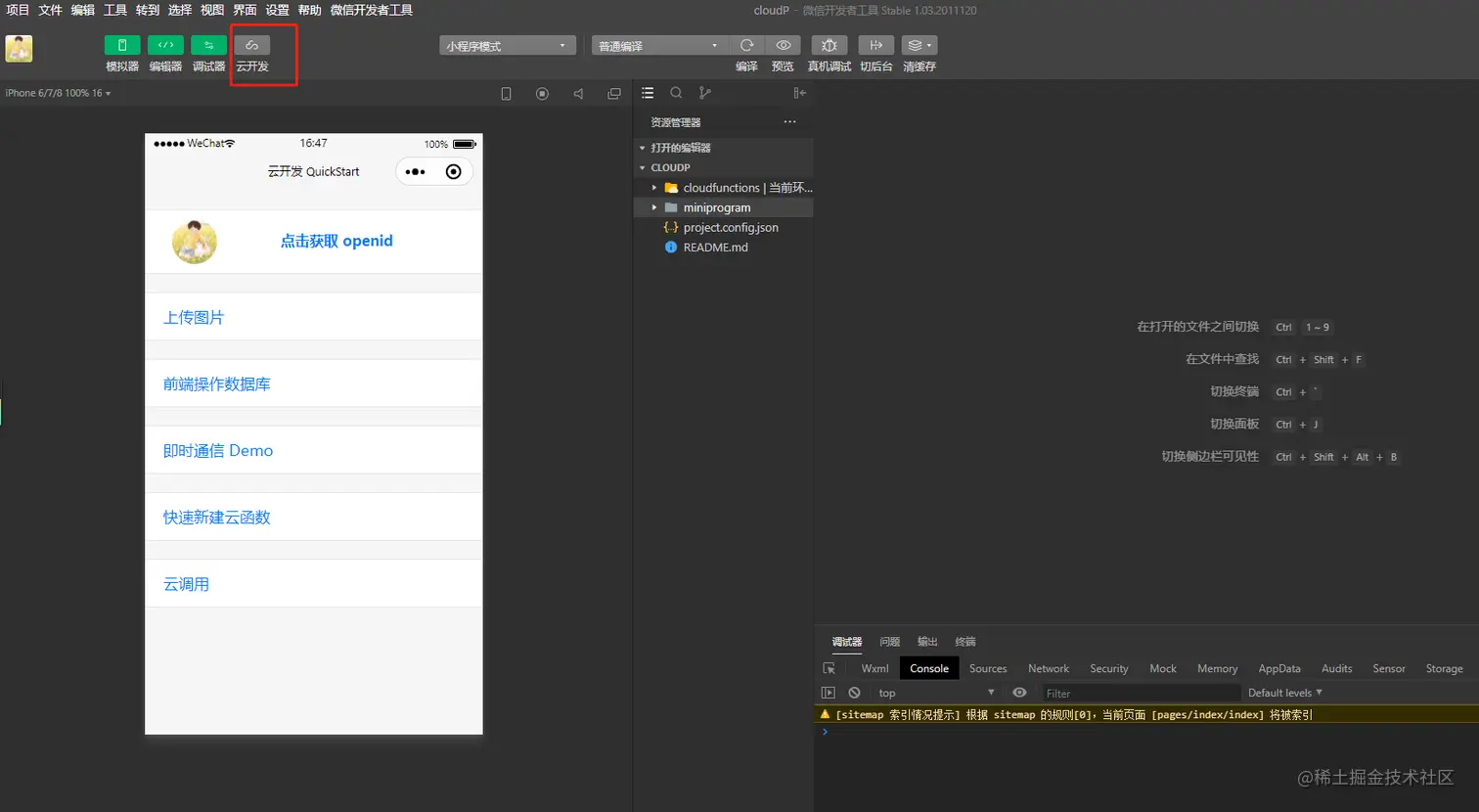 2、创建成功后会进入这样一个界面,然后我们就可以点击云开发按钮,进入开通阶段,暂时可以选择免费版本的。