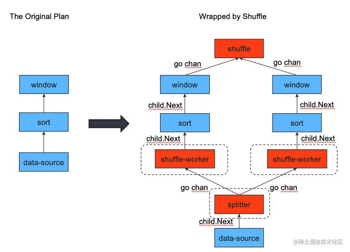 我们的优化思路是使用 Shuffle 算子来实现 MergeJoin 算子和 StreamAggregation 算子的并行化。Shuffle 算子最先在 PR github.com/pingcap/tid… 中引入,用于并行化 Window 算子。图 1 展示的就是 Window 算子的并行化过程。