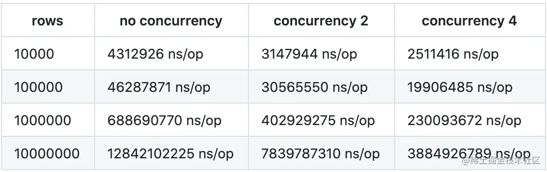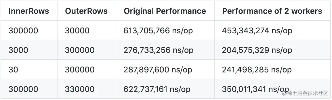 图 3 展示的就是数据源无序情况下 MergeJoin 的并行化过程,这种情况 MergeJoin 和 Sort 算子的计算开销都可以分摊到多个协程上。启动 2 个 worker 的优化效果如表 1 所示,我们在不同规模的数据源上都做了测试,表中前两列是两个数据源的行数,表中的后两列是串行和并行版本的运行性能,单位是 ns/op,越小性能越高。从表中可以看出, Shuffle 是可以明显加速 MergeJoin 运算的,并且数据量越大的情况下加速效果越好(因为并行化是会引入管道、协程等额外开销的,比较大的数据量才能保证并行化的收益大于开销)。在我们的几个测试案例中,效果最好的情况下 2 个 worker 的运算时间仅为串行版本的 56.5% 。