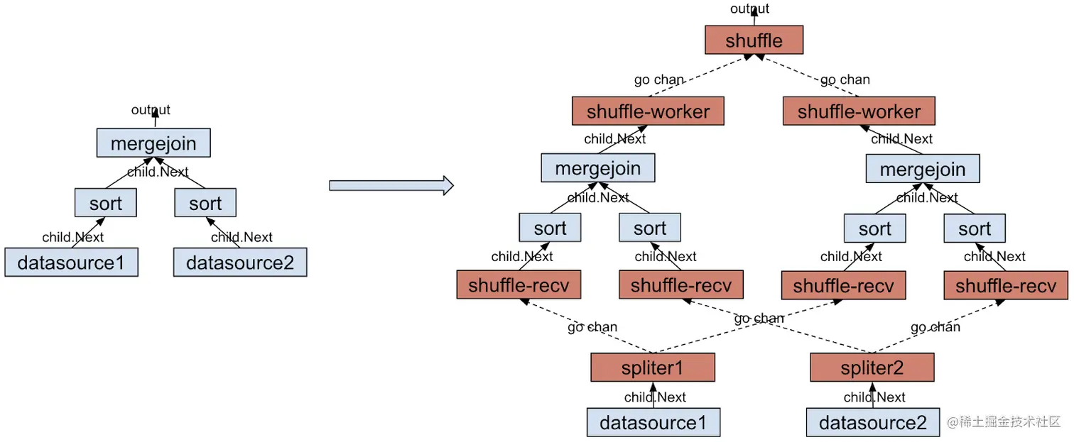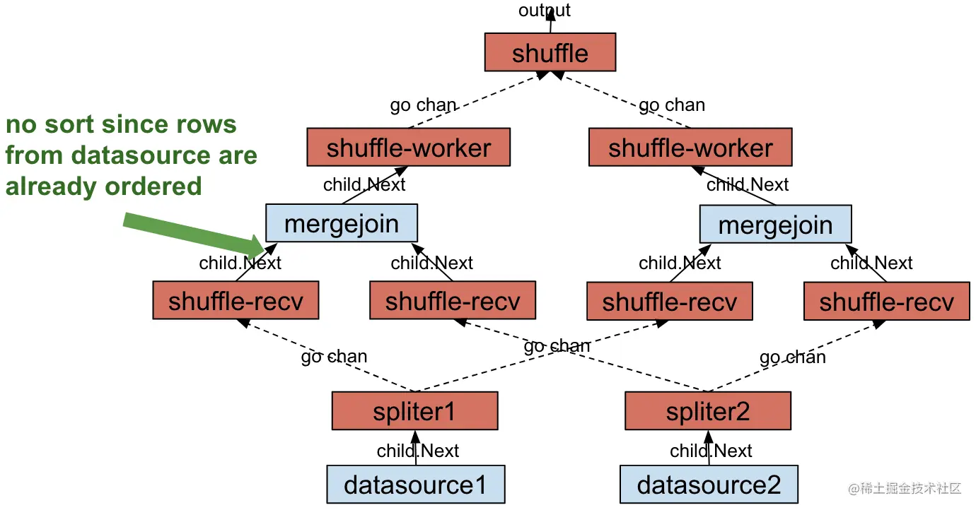 1. 因为 ShuffleWorker 时数据分区,所以并行后的每个 MergeJoin 需要两个 ShuffleWorker 来接收来自两个数据源的数据,但是 ShuffleWorker 同时又是计算并行的基本单元,于是有 n 个 MergeJoin 算子就会出现 2n 个协程,同一个 MergeJoin 算子的两个协程还会出现数据竞争。