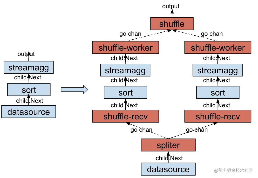 图中左侧是串行的 Window 算子,因为 Window 算子要求输入数据有序,所以在数据源和 Window 之间通常有一个 Sort 算子。图中右侧展示的是对应的 Shuffle 算子,为了完成并行计算,Window 算子和 Sort 算子都被复制了多份,每一份与一 ShuffleWorker 相对应,从数据源流入的数据由 Splitter 按哈希值拆分为独立的数据分区,发往不同的 ShuffleWorker ,最终各个 Window 算子的结果汇总后输出。图中所画箭头就是数据流动的方向,其中数据的分发和结果的汇总是通过 go channel 来实现的,其它数据流动都是父节点通过调用子节点的 Next 方法来获取的。图中虚线表示启动的协程,每个 ShuffleWorker 都会启动一个协程来完成自身的运算,同时 Splitter 也会启动一个协程来完成数据的分发。
