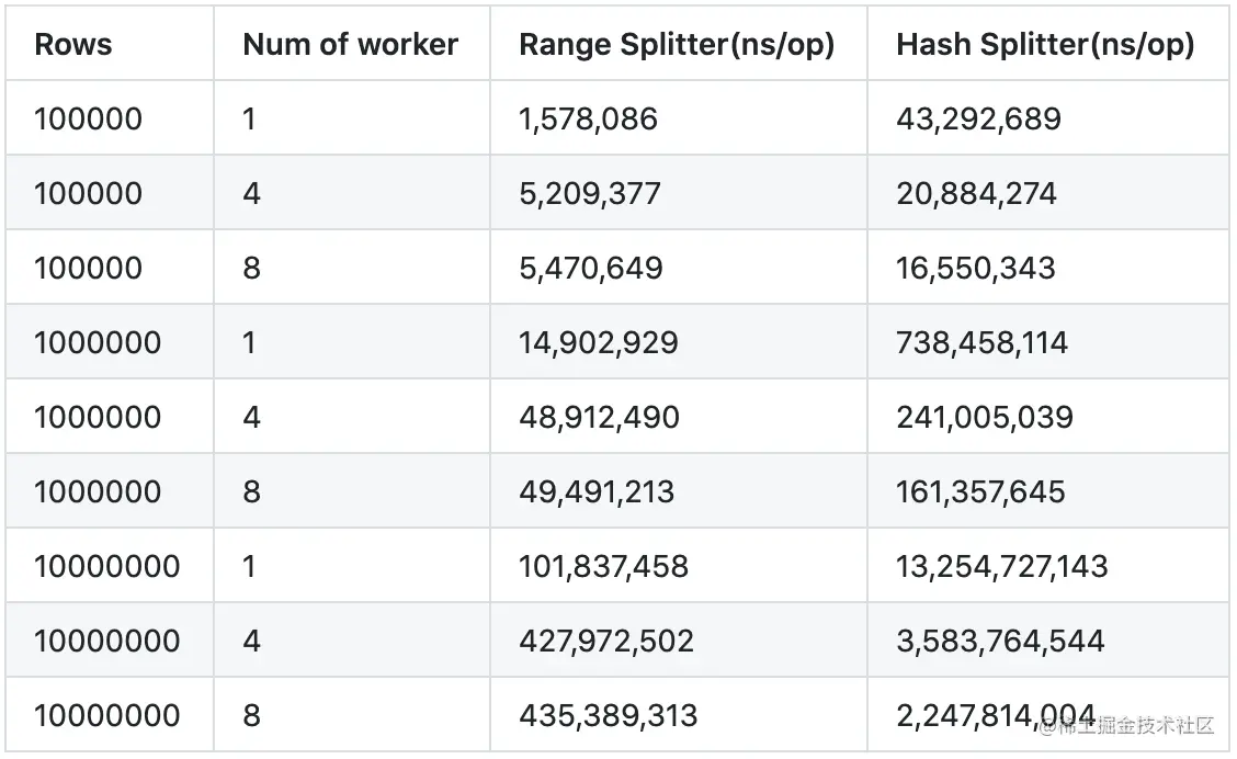 上面说了, Shuffle 算子会把数据输入分割成多个 Partition,最开始的时候只有基于 Hash 方法的 Splitter 被实现,该实现对输入数据是否有序并不做要求。对于数据源有序的情况,尽管该方法依旧适用,但是使用基于 Range 的方法对数据源进行分割,是一个更为自然的方式,因为被聚合 key 相同的多行数据,必然是紧挨在以前的,如果可以直接找到这一块数据的起始点和结束点,整体一次性分割,则无需构建 HashTable,也不用调用开销更为明显的 HashFunction,使得Partiton 过程的开销更小。基于这一思路,我们实现了 PartitionRangeSplitter,该方法的计算原理是,将紧挨一起的相同聚合 key 的多行数据,批量地分发到一个 worker 之上。相较于基于 Hash 方法的 Partitioner 而言,基于 Range 方法的实现方式的开销更小,在同时处理有序输入数据源的情况下,使用 RangePartitioner 能比使用 HashPartitioner 快上一倍的速度(详见表 3),由此证明了该算子更加适用于数据源有序的情况。