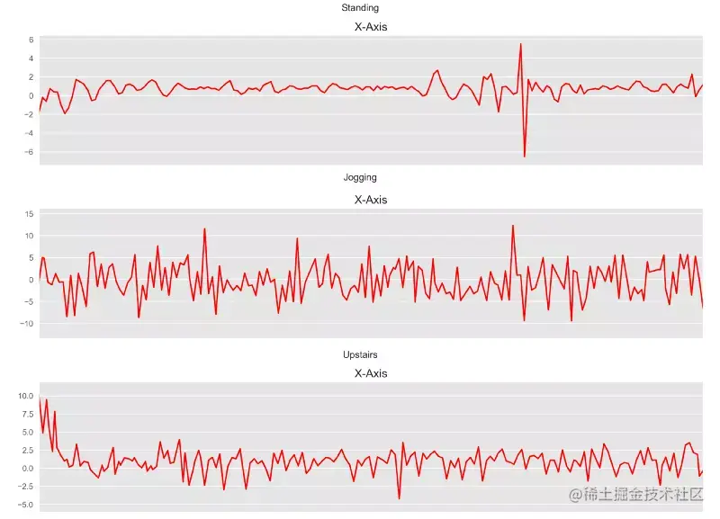 在本文中,我们将专注于基于时间片的加速度传感器数据的处理,这些数据来自于用户的腰带式智能手机设备。基于 x、y 和 z 轴的加速度计数据,1D CNN 用来预测用户正在进行的活动类型(比如 “步行”、“慢跑” 或“站立”)。你可以在我的另外两篇文章中找到更多的信息 这里 和 这里。对于各种活动,在每个时间间隔上的数据看起来都与此类似。