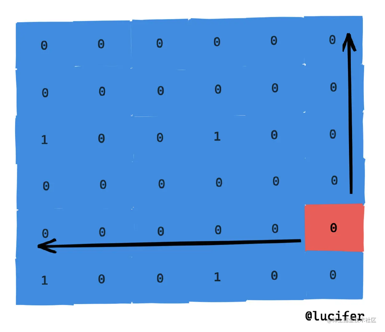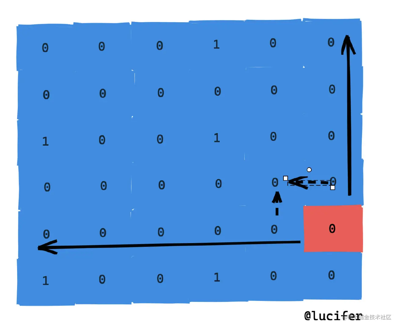 比如我想计算以如下图红色格子为右下角的最大黑方阵。我们可以从当前点向上向左扩展直到非 0。