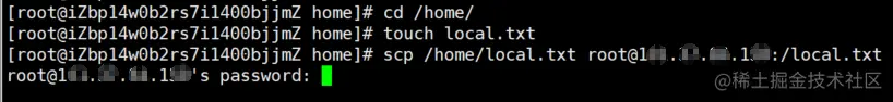 执行该命令后同样会提示你输入远程服务器的密码,输入完成后查看一下本地服务器的/home目录下是不是有一个local_copy.txt