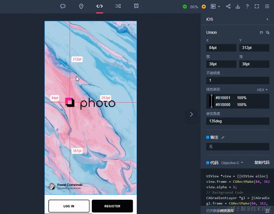 本次更新后,我们对富文本解析功能进行了进一步完善。设计稿导入到摹客后,点击元素就能看到间距、颜色、字体样式、阴影、圆角大小等标注信息,还可以手动补充文字、坐标、颜色、尺寸、区域标注,信息更全面,更准确,帮助开发还原设计稿。自动生成的CSS / Android / Objective-C / Swift代码,开发小伙伴可以直接复制使用,省去了许多繁琐的劳动。