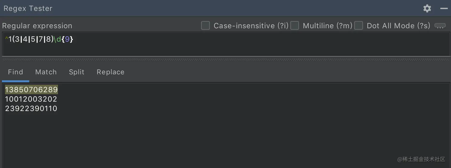 点击进入后,就出现了如下界面。我随手写了个匹配手机号码的正则(不一定准确),匹配到的字符串背景会被高亮。右上方还有一些选项如大小写敏感,多行模式等,可根据需要进行选择。Regex Tester 还提供了Split,Replace功能等。