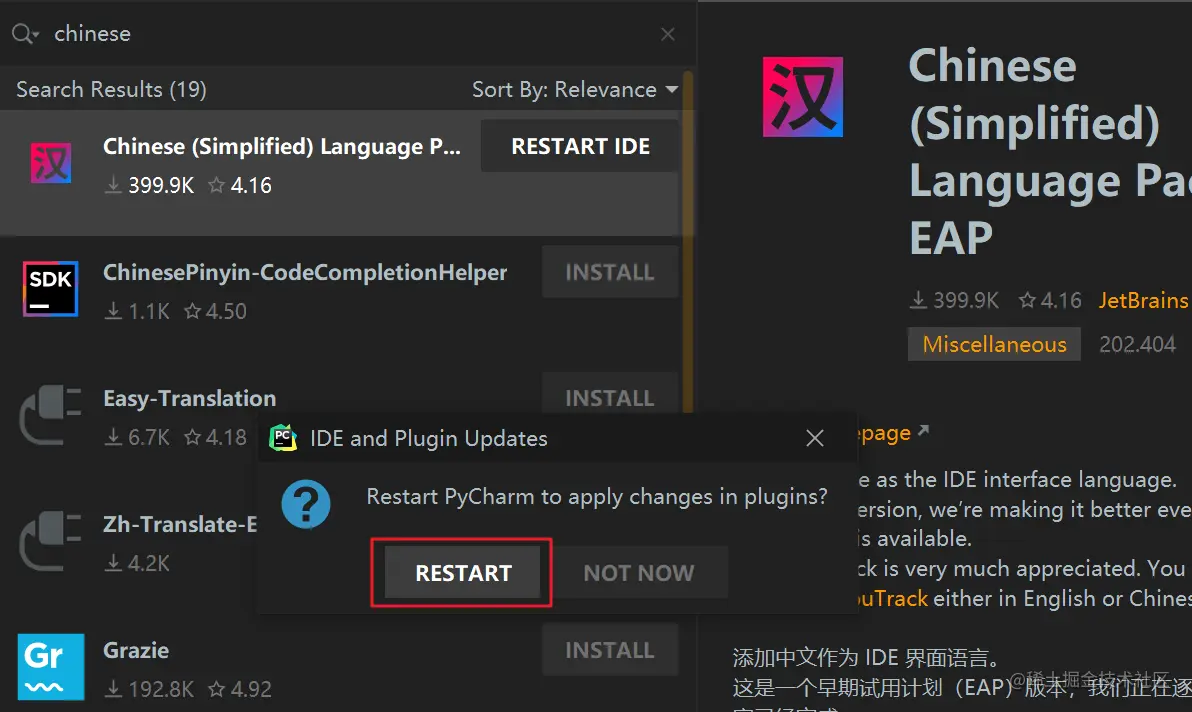 而现在,JetBrains 官方自己出了汉化插件,名字就叫: chinese,在插件市场里一搜,排名第一便是它,下载量已经 40 万,对比排名第二的民间汉化插件,简直不是量级的。