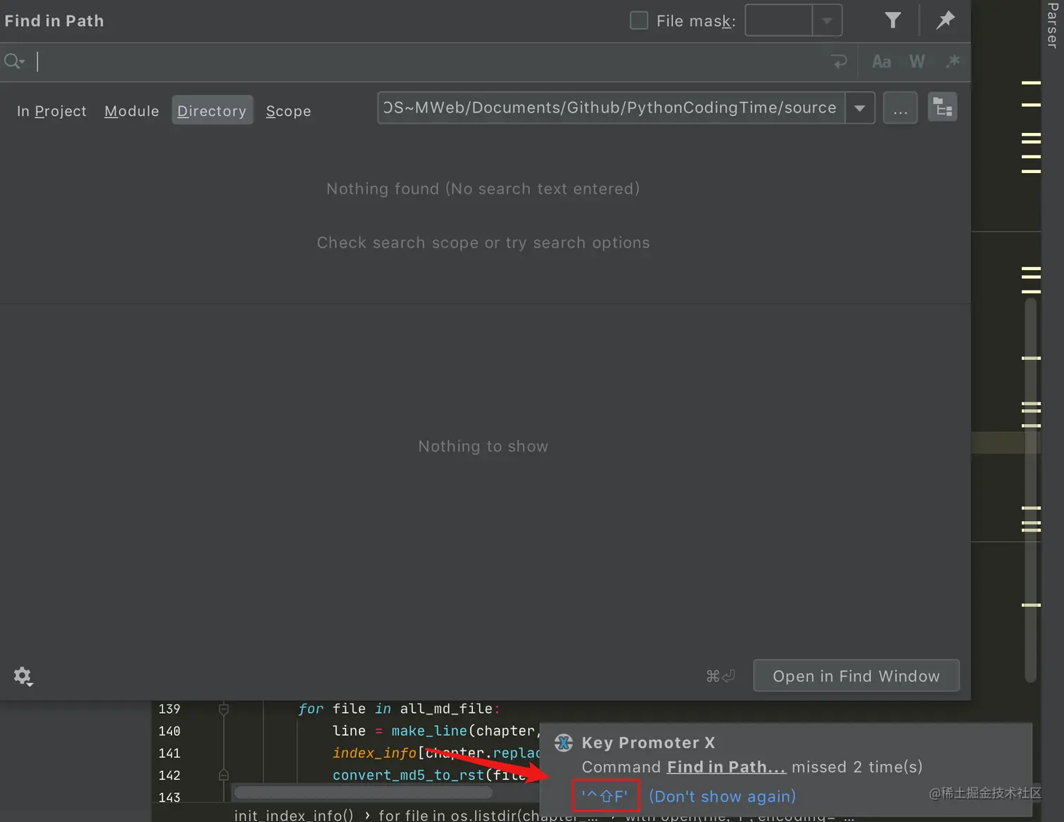 比如我使用鼠标点开 Find in Path,它就会在右下角弹窗提示你该用哪个快捷键。