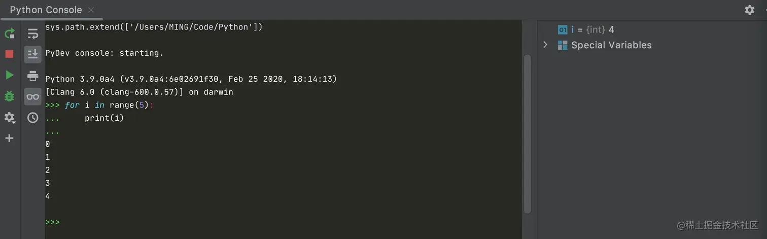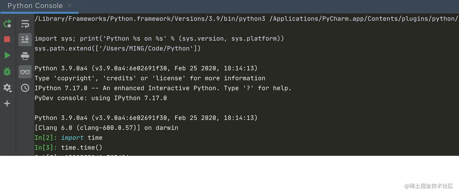接着 PyCharm 就会弹出一个 Python Console 窗口,然后运行你所选择的代码。