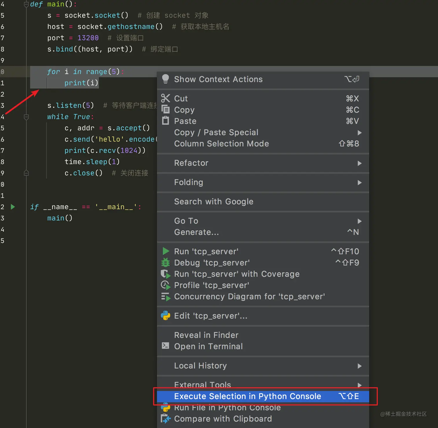 只要在当前文件中,写好代码,然后光标选择后,右键点击 Execute Selection in Python Console 或者 使用快捷键 option + shift + E (windows 上是 alt + shift + E)。