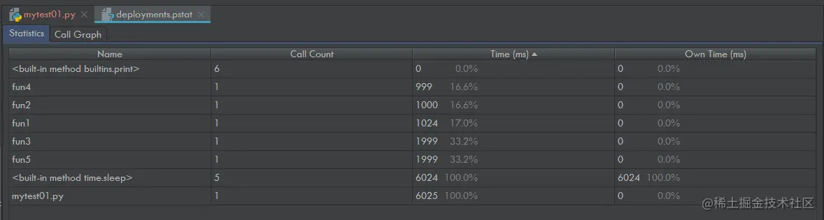 - 从图中可以看出Test.py直接调用了fun3、fun1、fun2和fun5函数;fun5函数直接调用了fun4函数;fun1、fun2、fun3、fun4和fun5都直接调用了print以及sleep函数;整个测试代码运行的总时间为6006ms,其中fun3的运行时间为1999ms,所占的时间百分比为33.3%,也就是 1999ms / 6006ms = 33.3%。
