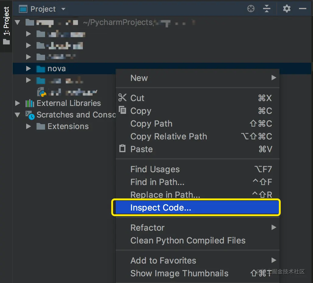你只需要像下面这样点击项目文件夹,然后右键,选择 Inspect Code,就可以开启静态检查。