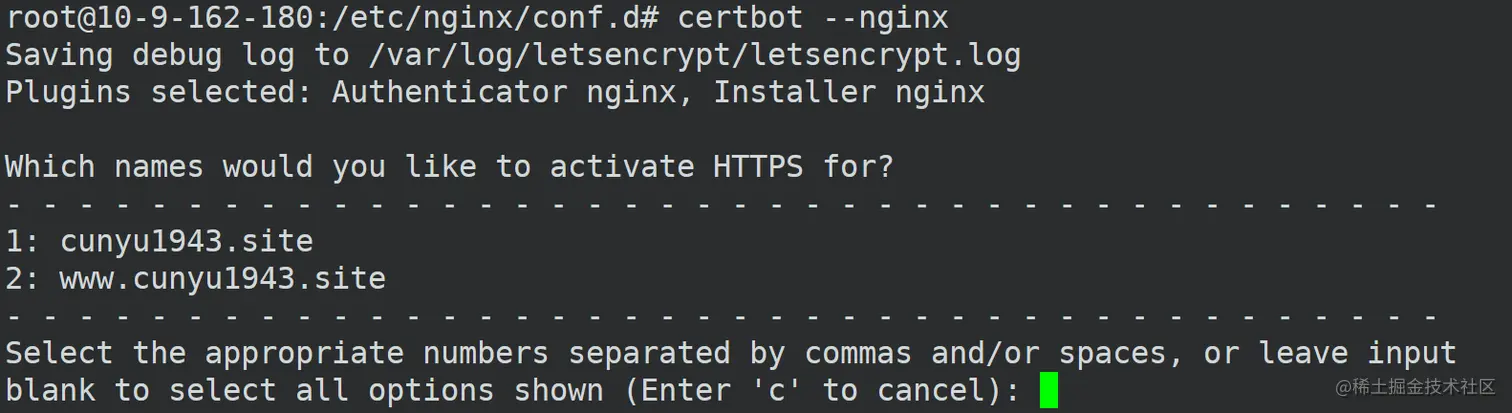 接着执行配置,过程中会询问为哪个域名添加证书,以及是否重定向,如实选择即可;
