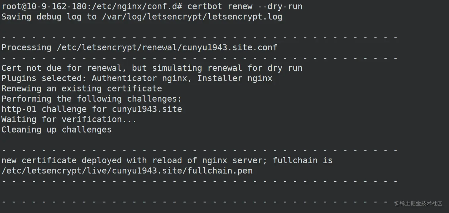 只需要将其中的 example.com 修改成自己的域名即可,比如我的域名是 cunyu1943.site;