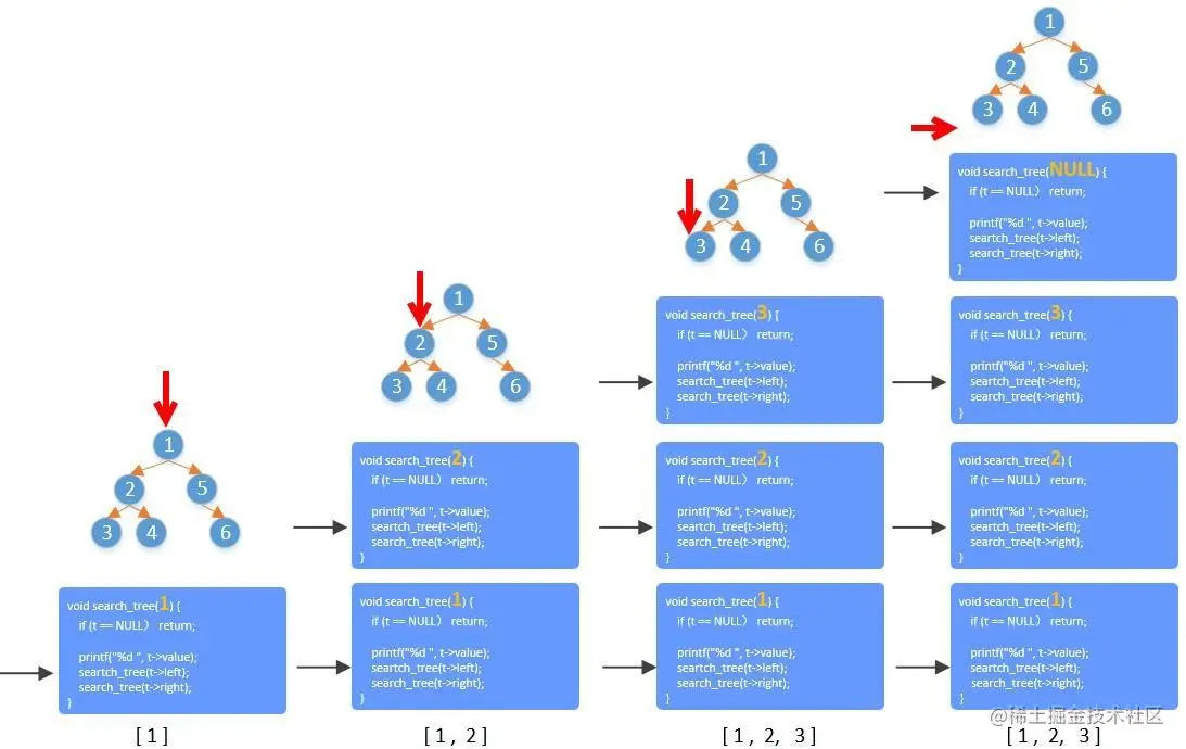 首先在根节点1上调用search_tree(),当打印完当前节点的值后在1的左子树节点上调用search_tree,这时第二个函数帧入栈;打印完当前节点的值(2)后在2的左子树上调用search_tree,这样第三个函数帧入栈;同样是打印完当前节点的值后(3)在3的左子树上调用search_tree,第四个函数帧入栈;由于3的左子树为空,因此第四个函数帧执行第一句时就会退出,因此我们又来到了第三个函数帧,此时节点3的左子树遍历完毕,因此开始在3的右子树节点上调用search_tree,接下来的过程如图所示: