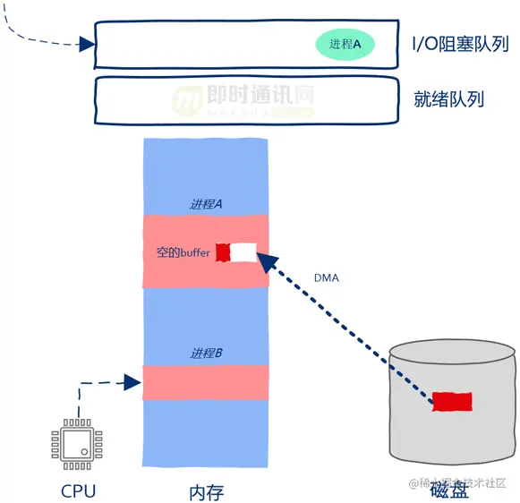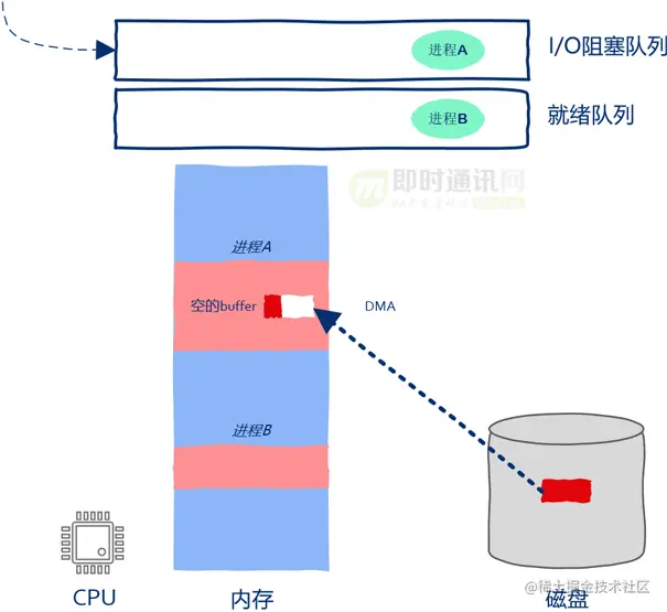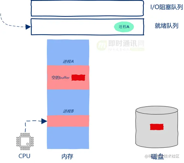 操作系统接收到磁盘中断后发现数据copy完毕,进程A重新获得继续运行的资格,这时操作系统小心翼翼的把进程A从阻塞队列放到了就绪队列当中。