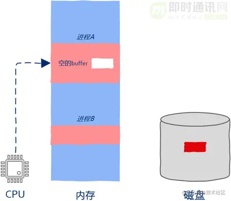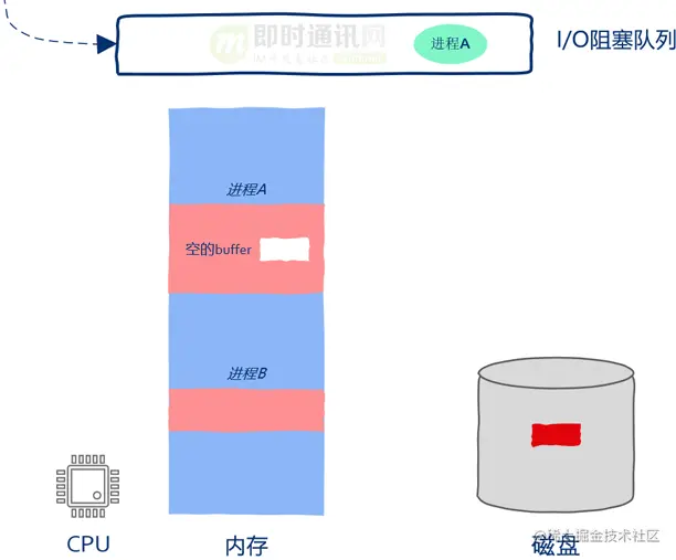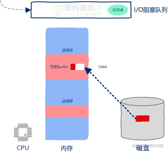 这时操作系统已经向磁盘发送了I/O请求,因此磁盘driver开始将磁盘中的数据copy到进程A的buff中。虽然这时进程A已经被暂停执行了,但这并不妨碍磁盘向内存中copy数据。