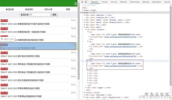 进入该网站,在该网站上按下F12,就能跳出该网站的源代码。找到并进入elements,就能找到众多标准号对应的信息网址,首先利用爬虫程序将这些标准号的号码和所对应的网址爬取下来,进一步收集该标准号的具体信息。