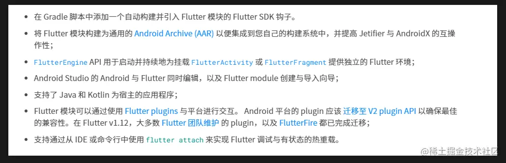 • 现如今Flutter官方在AS中已经提供了将flutter作为模块,导入的原生的工程当中,实现了三端分离的开发模式(三端分离指:将Flutter工程作为原生工程的子模块,维持原有的原生工程管理方式不变)。截止到2020.12.25,Flutter Module已经支持如下的特性:
