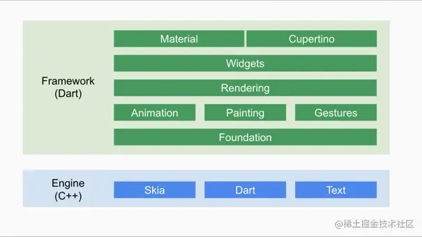Engine:用C、C ++、Dart和Skia(2D渲染引擎)构建。负责线程管理、Dart VM状态管理和Dart代码加载等工作。