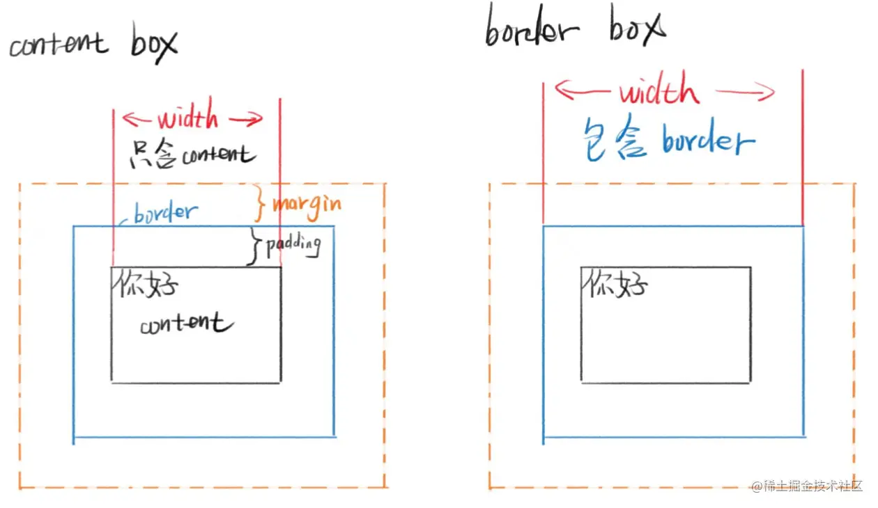 content-box 的宽度 width 表示内容区的宽度,不包含 padding 和 border;