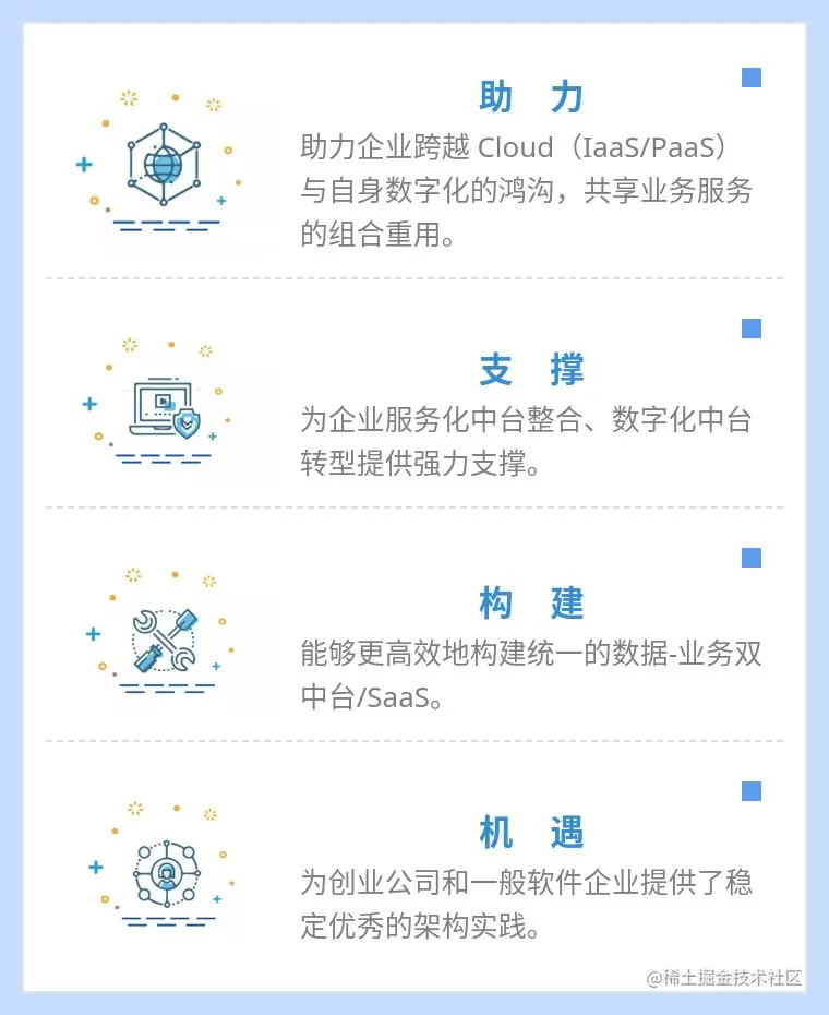 通过汉得20多年企业信息化项目经验和多次项目实践测试验证及不断迭代成长,**开发、整合、优化多种企业级应用开发必须的、通用性强的开源功能组件,**能够免去重复开发之苦,将精力聚焦于行业逻辑,快速构建个性化业务应用。将开源组件构建成统一的开发平台,达到高可用性和高稳定性,同时提升易用性,为企业服务化中台整合、数字化转型提供强力支撑,也为企业提供最佳架构实践。