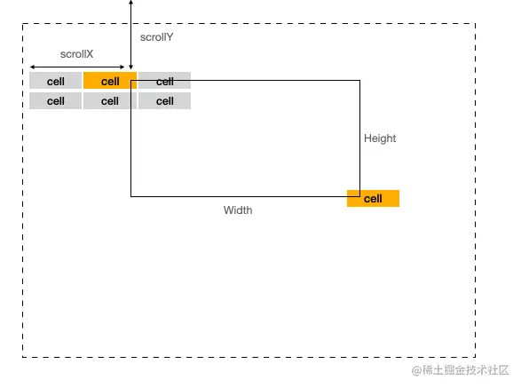 按照这个图的计算逻辑,我们需要遍历 row*col次,对所有单元格计算是否在[scrollX,scrollY],[scrollX+width,scrollY+Height]的范围内。然后让在范围内的单元格执行onCell函数即可