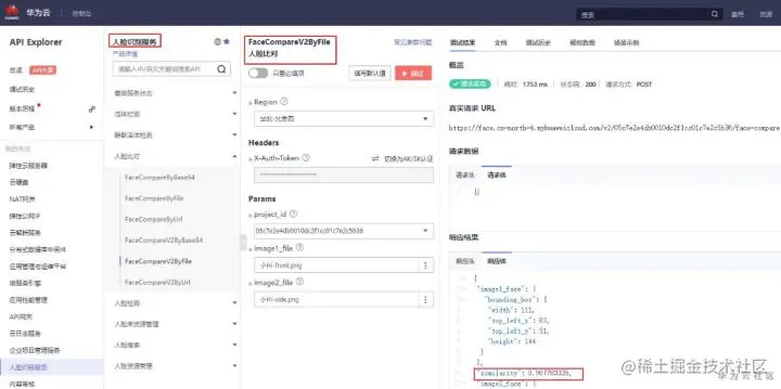 小Hi看到结果后,还是有点不太相信自己的眼睛,幸福来得太突然了吧?想到前段时间使用过API Explorer调试功能,于是想对比下两种方式的结果是不是一致的。…点击调试,结果真得一样(相拟度约为97%):