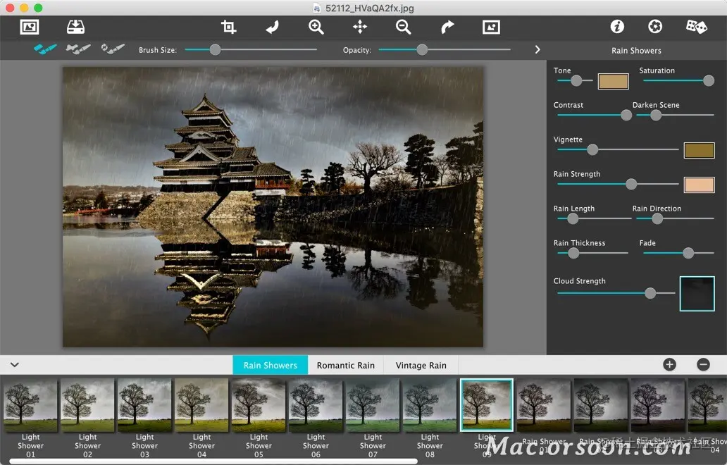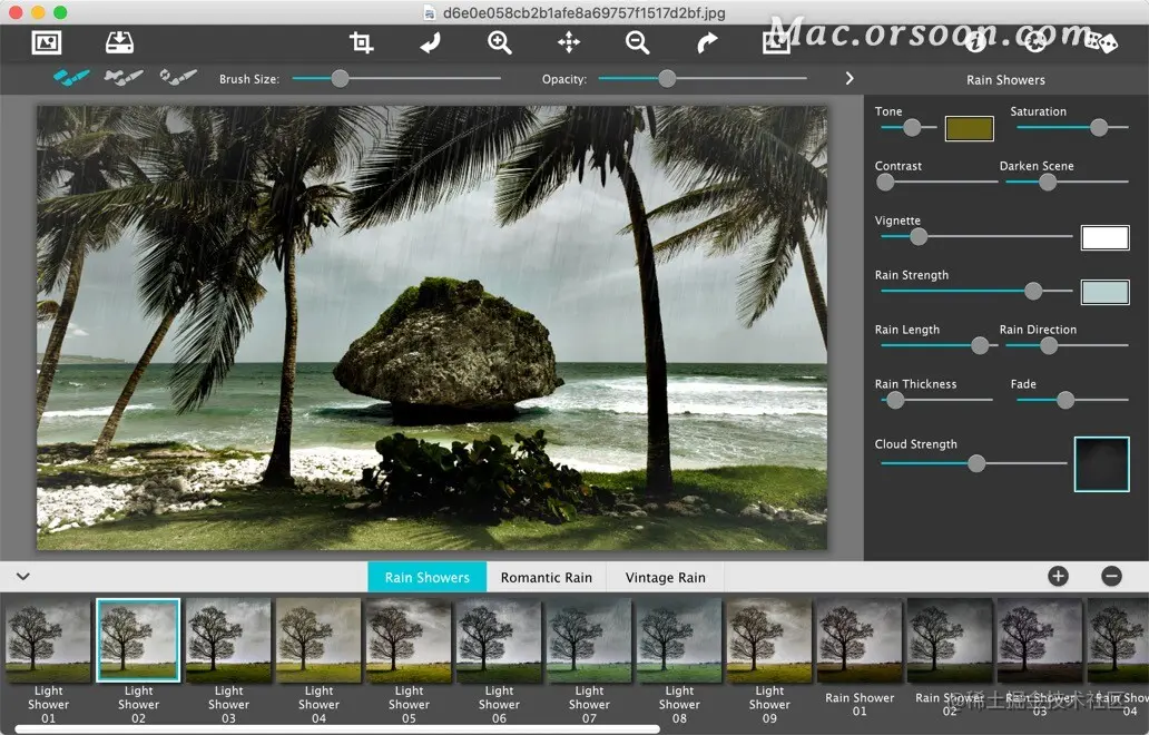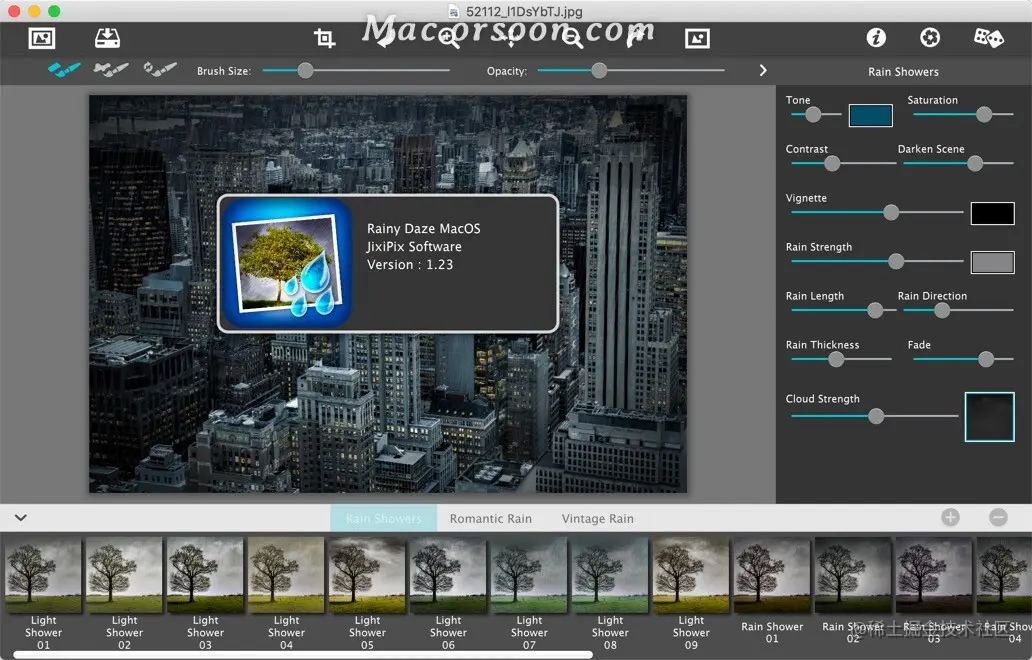 JixiPix Rainy Daze Mac是一款能够快速为您的摄影作品添加下雨效果的下雨特效制作软件,JixiPix Rainy Daze Mac版具有自定义功能,用户可以自行定义雨的长度、厚度和角度,为您的照片添加别具一格的雨!JixiPix Rainy Daze for Mac内含阵雨、复古雨和浪漫雨三种样式,JixiPix Rainy Daze for Mac操作非常简单,只需导入图片选择所需要的效果即可完成!