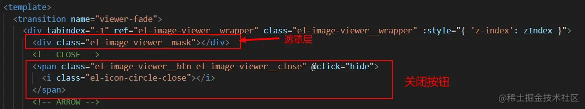 在查看image-viewer组件的源码发现,关闭按钮绑定hide方法,用于关闭预览的,但是遮罩层没有绑定任何方法,遮罩层也没有对外暴露任何方法调用,难受~