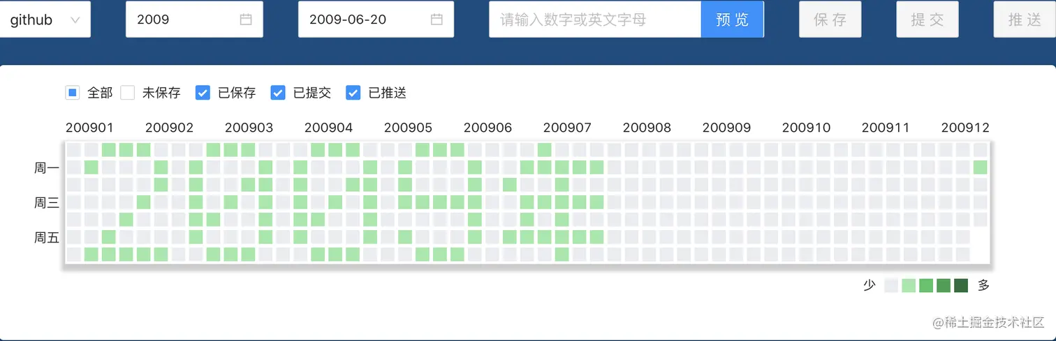 | 4 | 设置提交内容或样式 | 当前输入框可支持字符和日期范围输入。 1) 输入字符,当前仅支持大小写英文与数字,其余符号会解释成空格。 2) 输入日期范围,则会在相应的日期范围内显示提交信息。格式如下 [起始日期, 结束日期, 最低次数, 最高次数] , 若没有次数默认为1次, 只输入一个次数则所有日期都会提交该次数,若两个都有,则在最低和最高之间随机取值。 例: [20200202, 20201212, 1, 20]。 注意: 若是连续输入空格而无其他文字或字符,则是清空之前未提交但是已保存的信息。 |