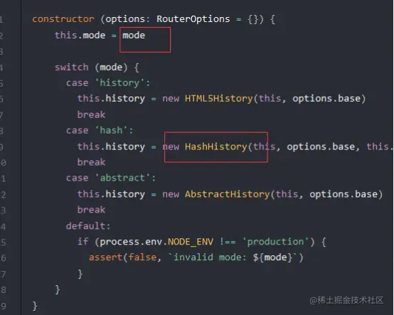 Vue-router 实例化时会初始化this.history,不同mode对应不同的history (例如果hash,对应hashHistory实例)