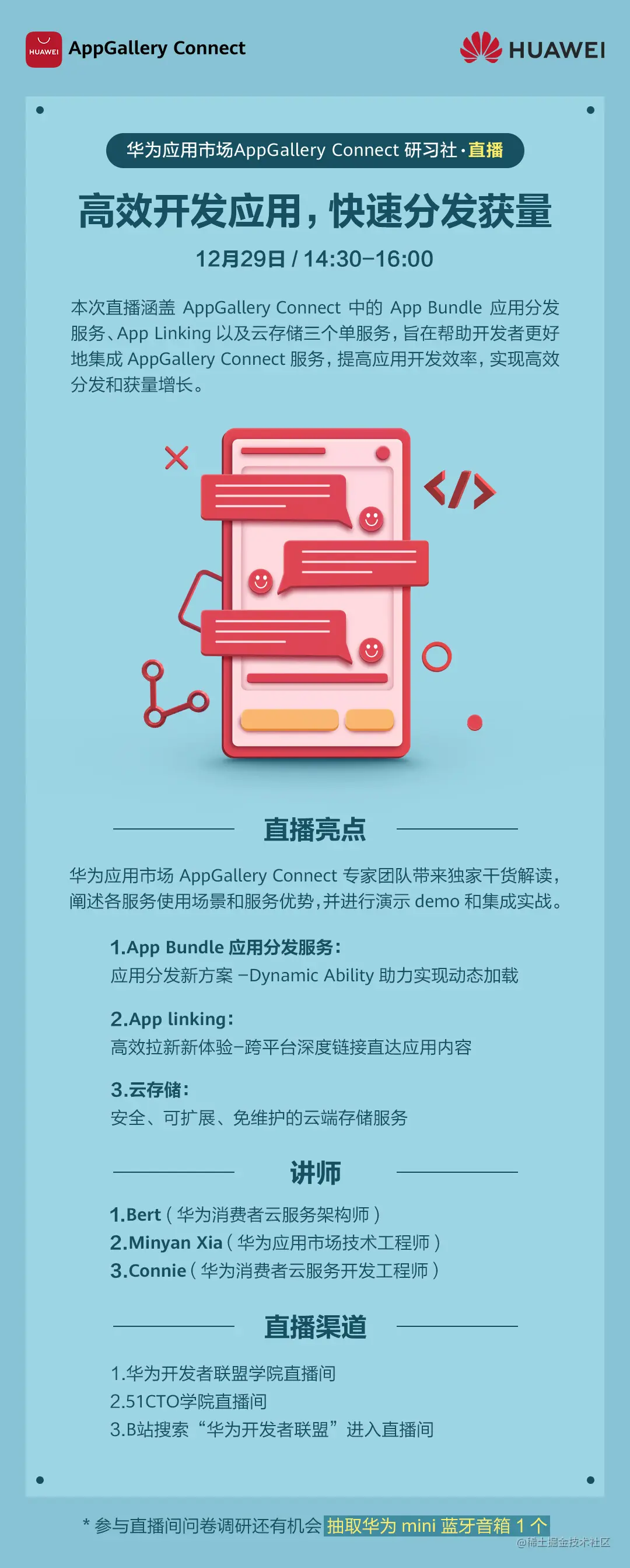 华为应用市场AppGallery Connect研习社·直播,助你高效开发应用,快速分发获量 最新资讯动态 2020-12-28 134 阅读1分钟 用户安装成功率低? 获取新用户很难? 用户文件存储与运维太耗时? 12月29日14点30分,华为应用市场AppGallery Connect专家团队将在线为大家带来丰富干货解读:App Bundle应用分发、App Linking以及云存储三个单服务,帮助开发者更好地集成AppGallery Connect服务,提高开发效率,快速分发并获取更多流量。赶紧进入华为开发者联盟官网,点击学院,进入AppGallery Connect研习社专区,参与直播吧!