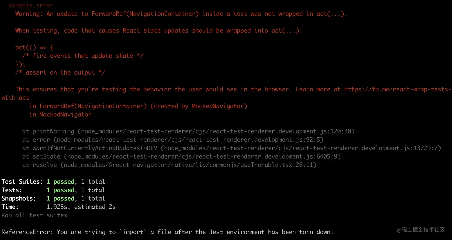 我要说明一下,如果没有我代码里面的 MockedNavigator.js 文件,那么就会出现下面的错误: