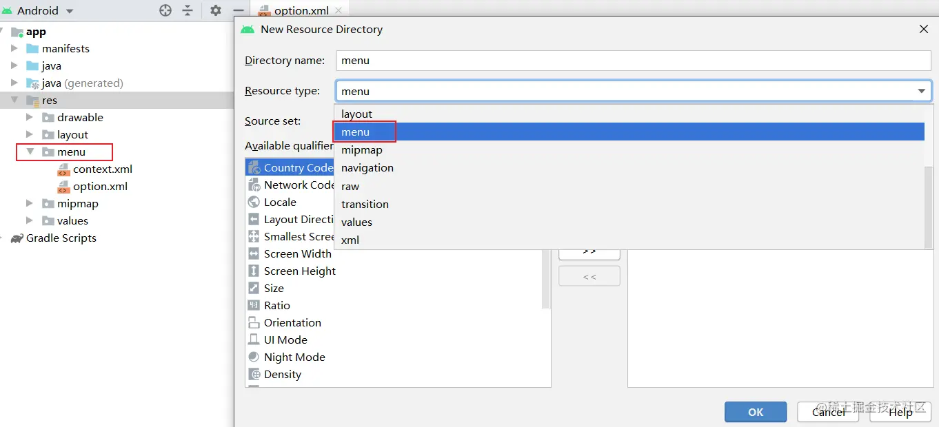首先在 res 目录下新建 menu 目录,新建一个 menu 的布局文件 option.xml