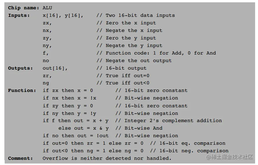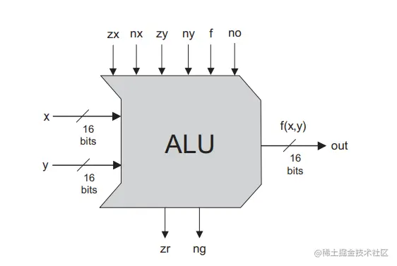 有了这些知识,就能搭建一个ALU,即算数逻辑单元了(它位于CPU中)。我们设想的电脑是16位的,设计的ALU如下: