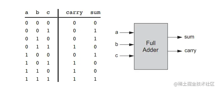 先从最简单的一位加法说起,一个全加器(称呼为此名字是因为还有半加器,半加器没有进位输入)有三个输入(两个要相加的数,一个进位输入),两个输出(和与进位输出)
