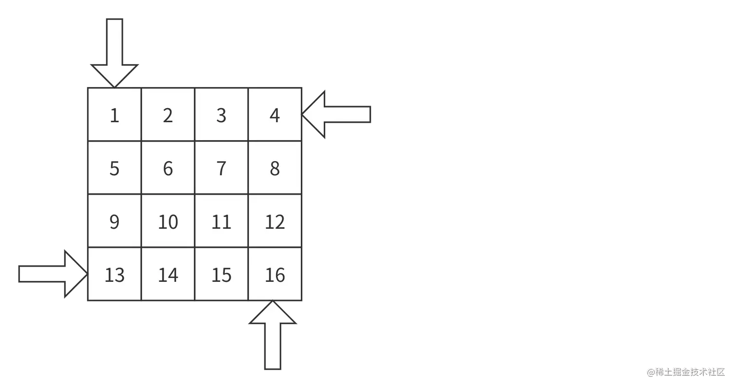 四次设置值是一个单元操作,之后指针变动第一个指针是水平向右移动,第二个指针是垂直向下其他依次,直到头length-1。那么外循环条件是有几圈2×2,3×3都只有一圈,4×4与5×5是两圈。也就是length/2圈,内循环为每圈要移动多少组数字它取决于终点索引,并且每往内一圈length都会少2两边都会靠近1格。