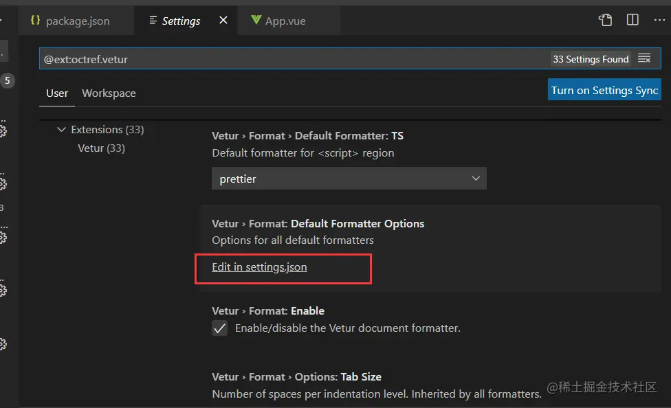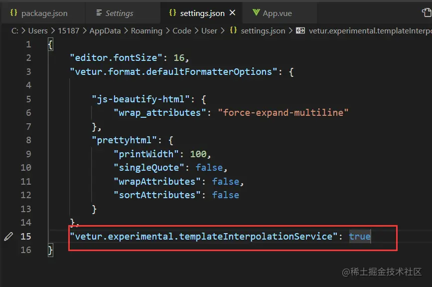 为了能在 vue 文件的 template 模板中使用语法提示,我们需要修改 vetur 的 settings.json 配置。新增 "vetur.experimental.templateInterpolationService": true